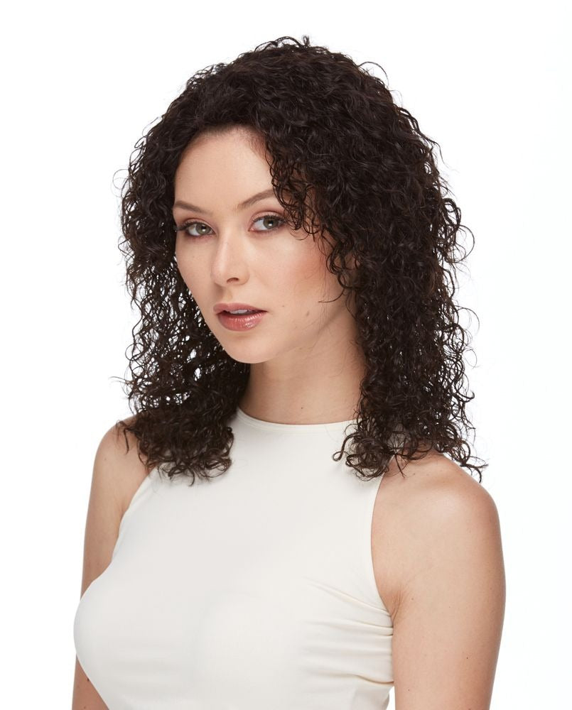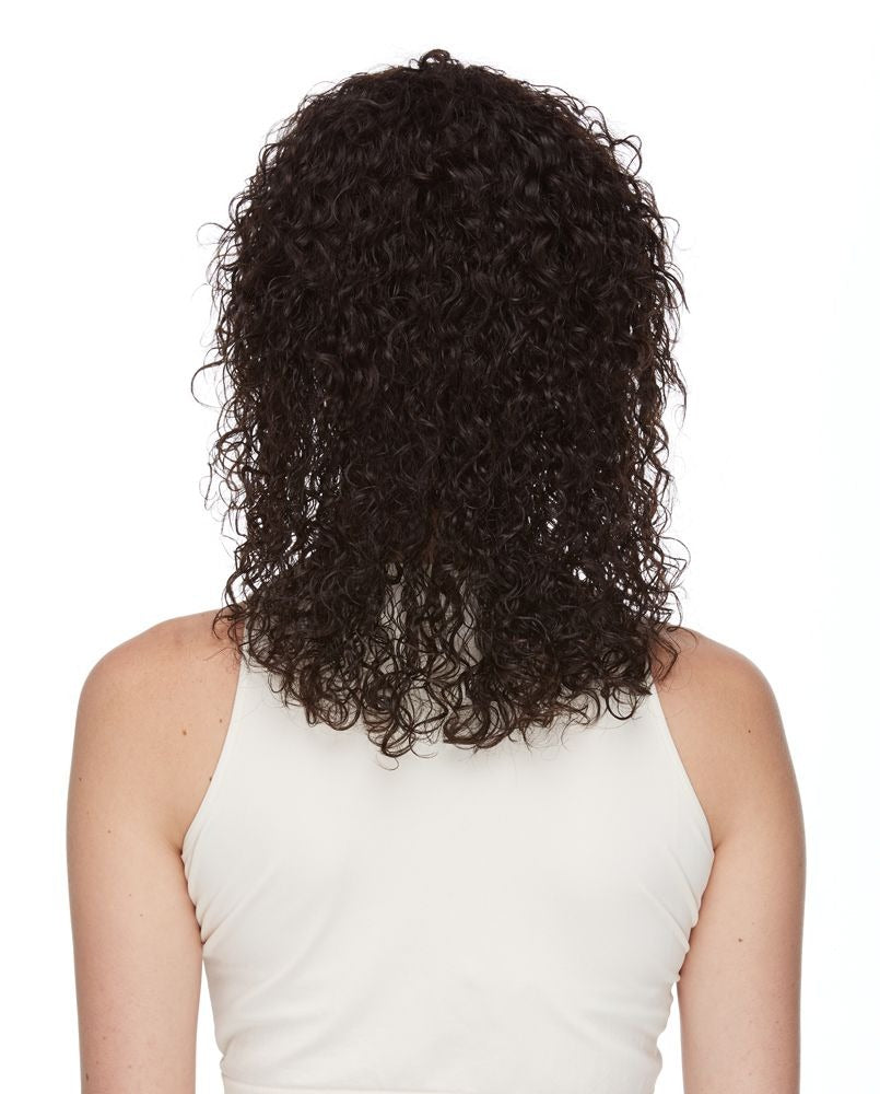 A MID LENGTH TIGHT SPIRAL CURLS THAT FALLS BELOW THE SHOULDERS WITH BLUNT CUT LAYERS AROUND THE FACE.