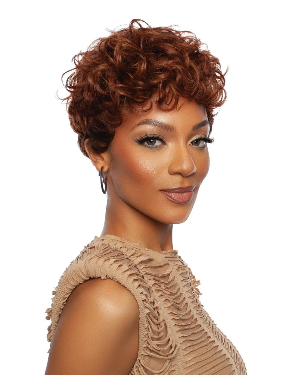 - Hair Style: Short, curly pixie